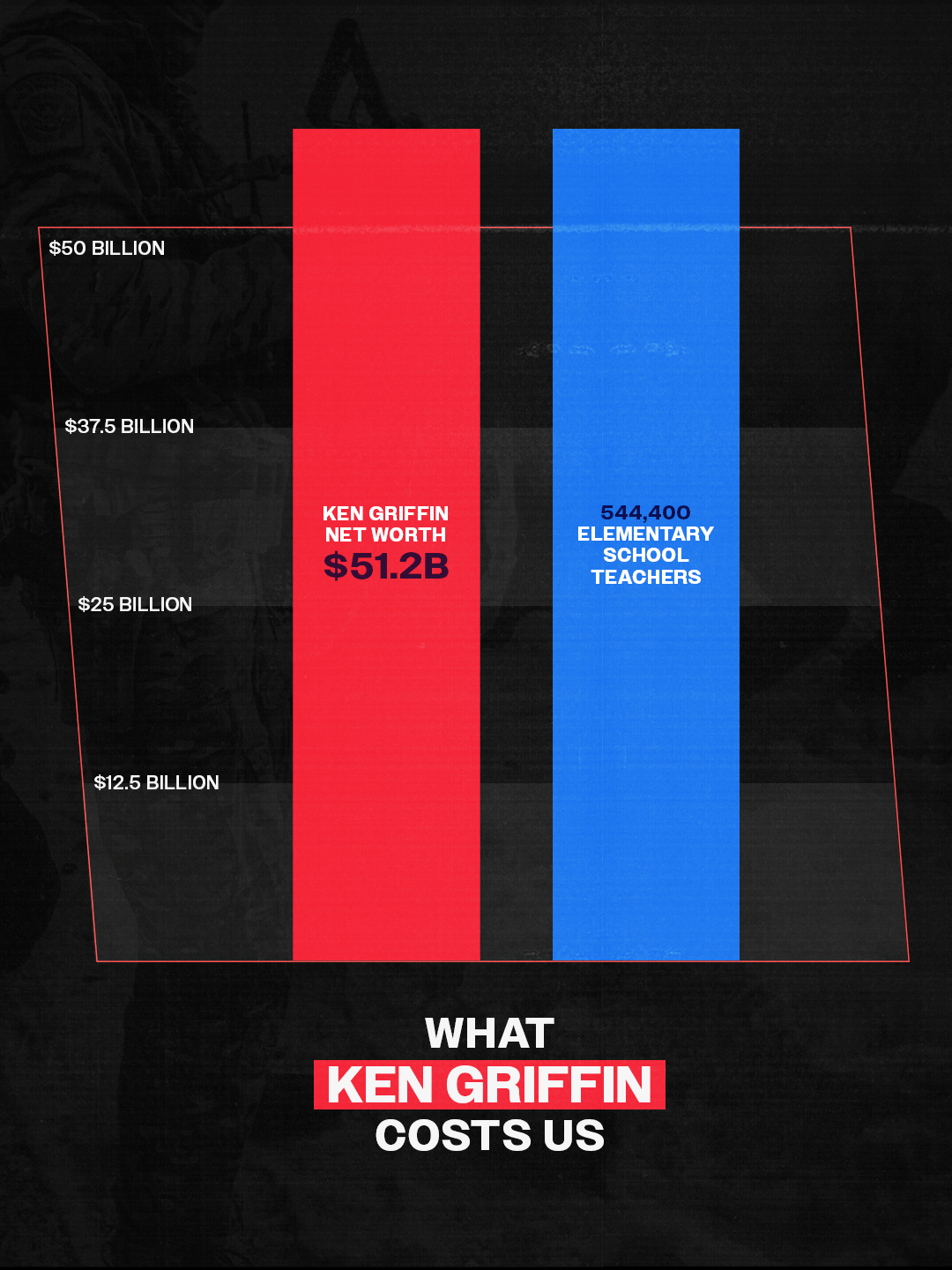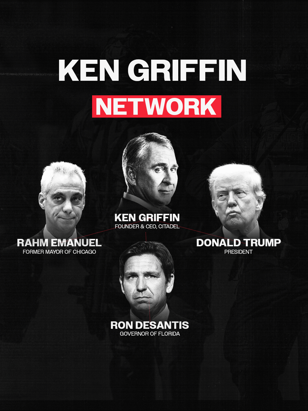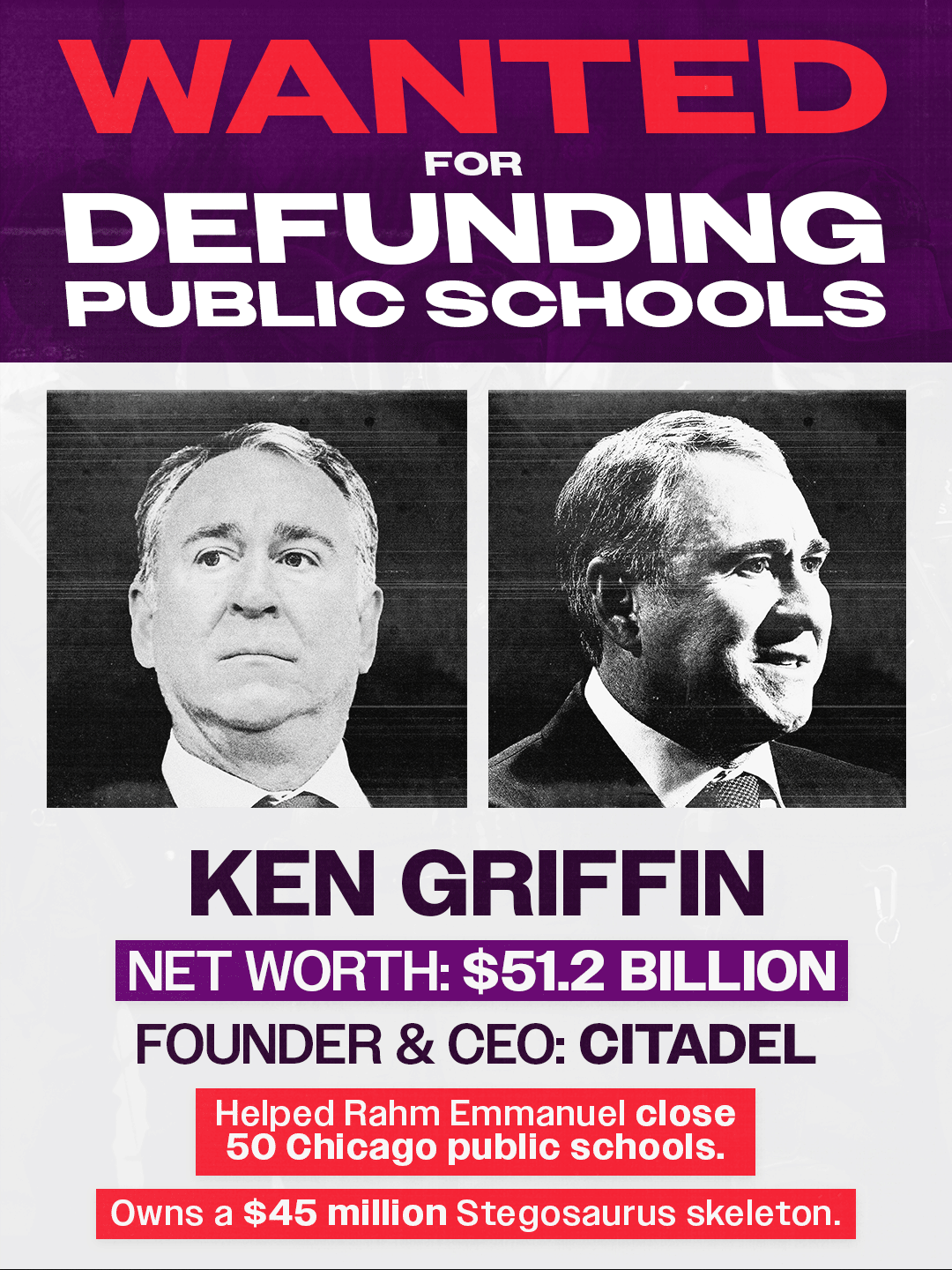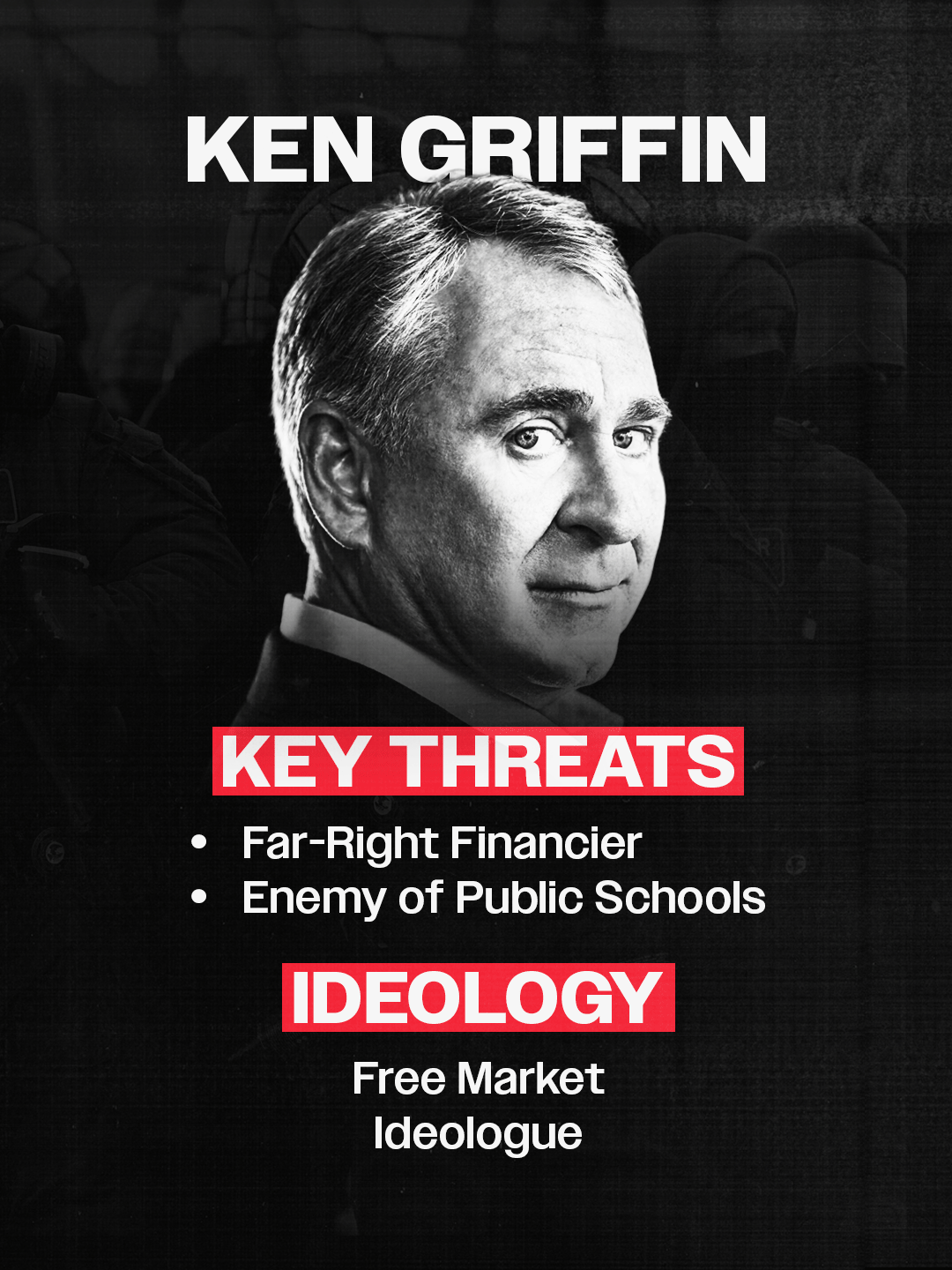 One of the biggest GOP donors in the country, Griffin is a key enabler of its attacks on the working class’ ability to resist corporate domination. While a self-declared “Reagan Republican” and Trump critic, Griffin reportedly gave $1 million to Trump’s inauguration, and has no problem cheering on Trump’s war against universities, saying protests against genocide in Gaza were the result of a “failed education system.” After supporting former Chicago Mayor and former Obama Chief of Staff Rahm Emmanuel when he closed public schools in 2015, his main residence(s) are now in Miami, where he aids Ron DeSantis’ “anti-woke” war on education.