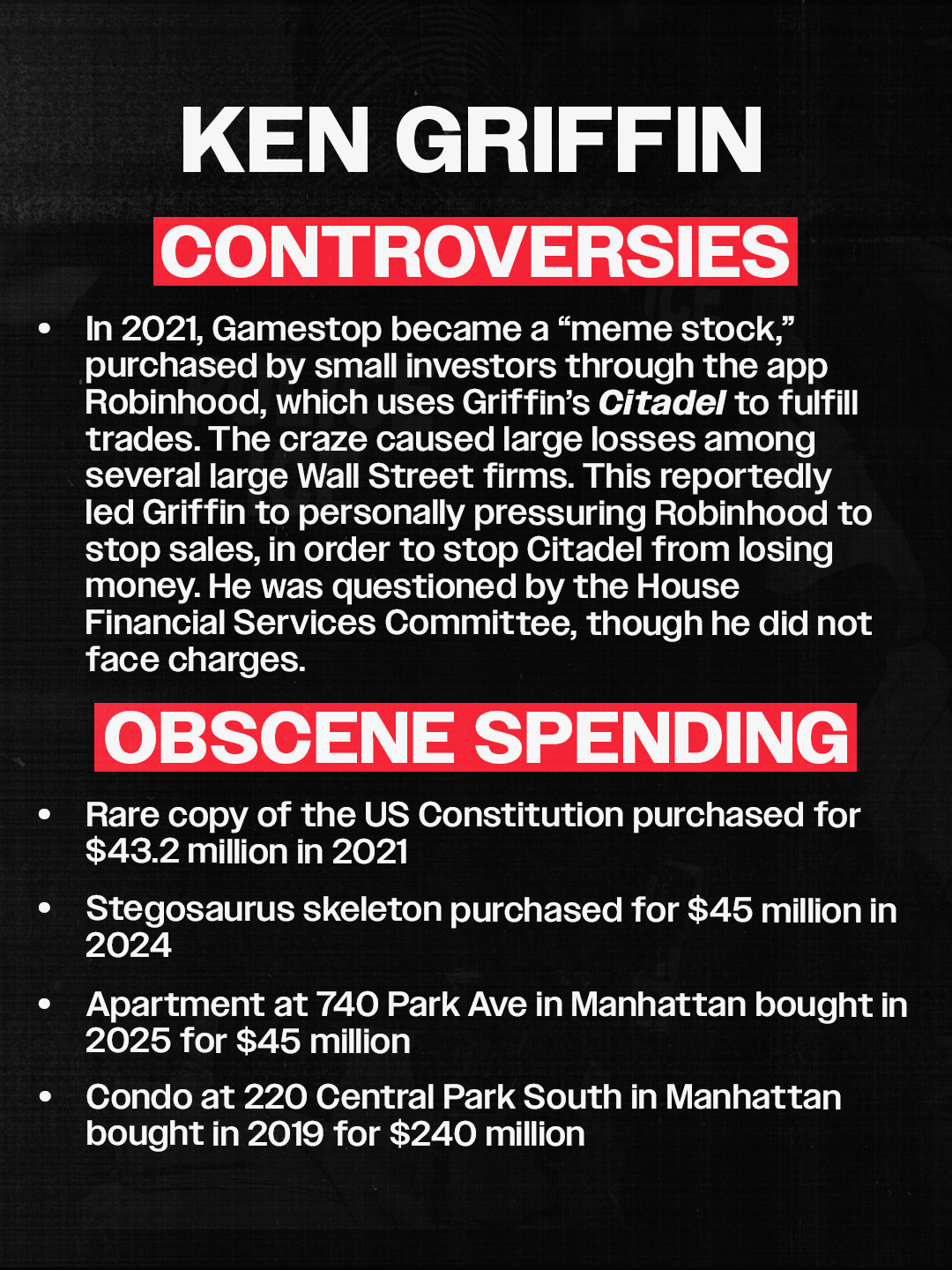 As one of the richest men in the world, Ken Griffin loves to flaunt his wealth even by Wall Street billionaire standards. Griffin, worth over $50 billion, has purchased ten homes, two private jets, an entire marina for superyachts, a $200 million Jackson Pollock painting, a first edition copy of the US Constitution, and a $45 million Stegosaurus skeleton. His hedge fund Citadel made headlines in 2021 for its role in the Gamestop trading scandal, but it’s where he spends his profits that should concern us most: the Republican Party.